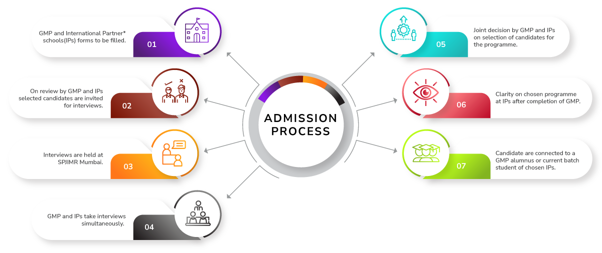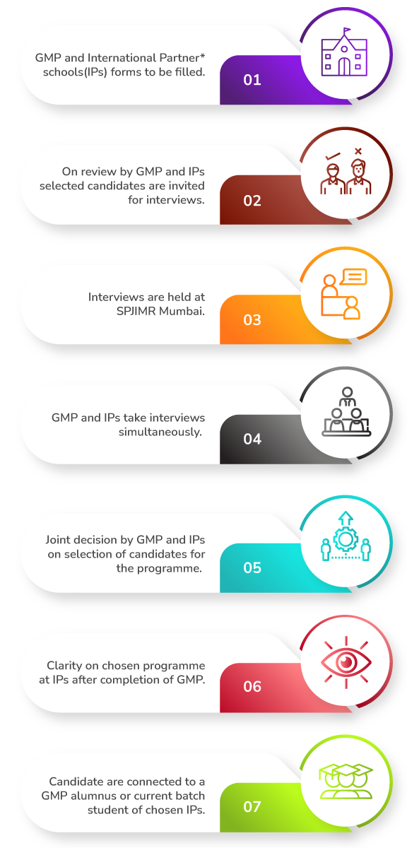 After a preliminary screening of the Application, the candidate is invited for an interview. For now interviews are conducted on Skype/zoom. The first round of interview is conducted by the SPJIMR faculty members. This is also an opportunity for you to ask key questions to ensure that the GMP at SPJIMR is the right program for you. Once you clear the SPJIMR Round you will receive an email from the admissions office within two days. Next the partner school connects with you for the interview. The invite is sent via email. Please check your spam mail and if you do not get an invitation within the next 5 -7 days, please connect with the GMP Admissions Team.