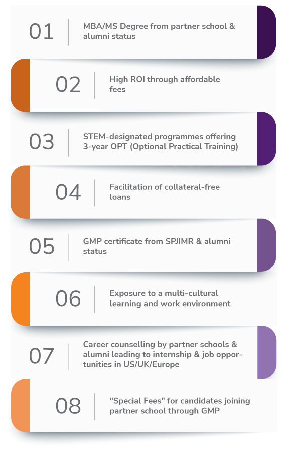 SPJIMR’s Global Management Programme (GMP) is a uniquely designed programme that includes 6 months on SPJIMR campus and 6-18 months at globally recognised international partner schools.