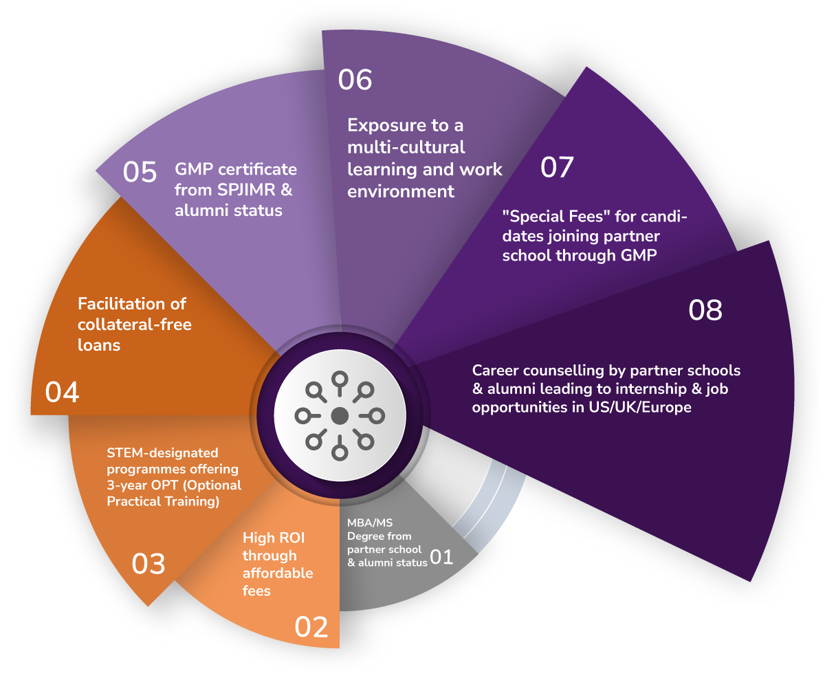 The Global Management Programme (GMP) offers a global curriculum and a diverse learning experience. It connects with some of the leading business schools globally. GMP provides exposure to General Management courses, with a focus on electives that prepare participants for the specializations at partner schools.